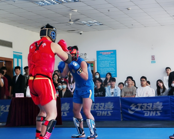 接着,随着主持人的一声令下比赛正式开始。本次比赛2021级和2022级8组16位选手在层层选拔中脱颖而出,角逐散打比赛不同重量级的冠亚军。赛场上,参赛选手身着散打服装、护具,或积极进攻,或巧妙防守,闪躲、出拳、假动作,出击有力迅猛。选手们各展身手,利用散打拳法、腿法、摔法等专业技术,进行了激烈而有技巧的对抗。他们顽强拼搏、奋力争先,以高昂的斗志演绎了一场方法与技巧的较量、一场速度与力量的比拼,观众的加油和掌声此起彼伏。