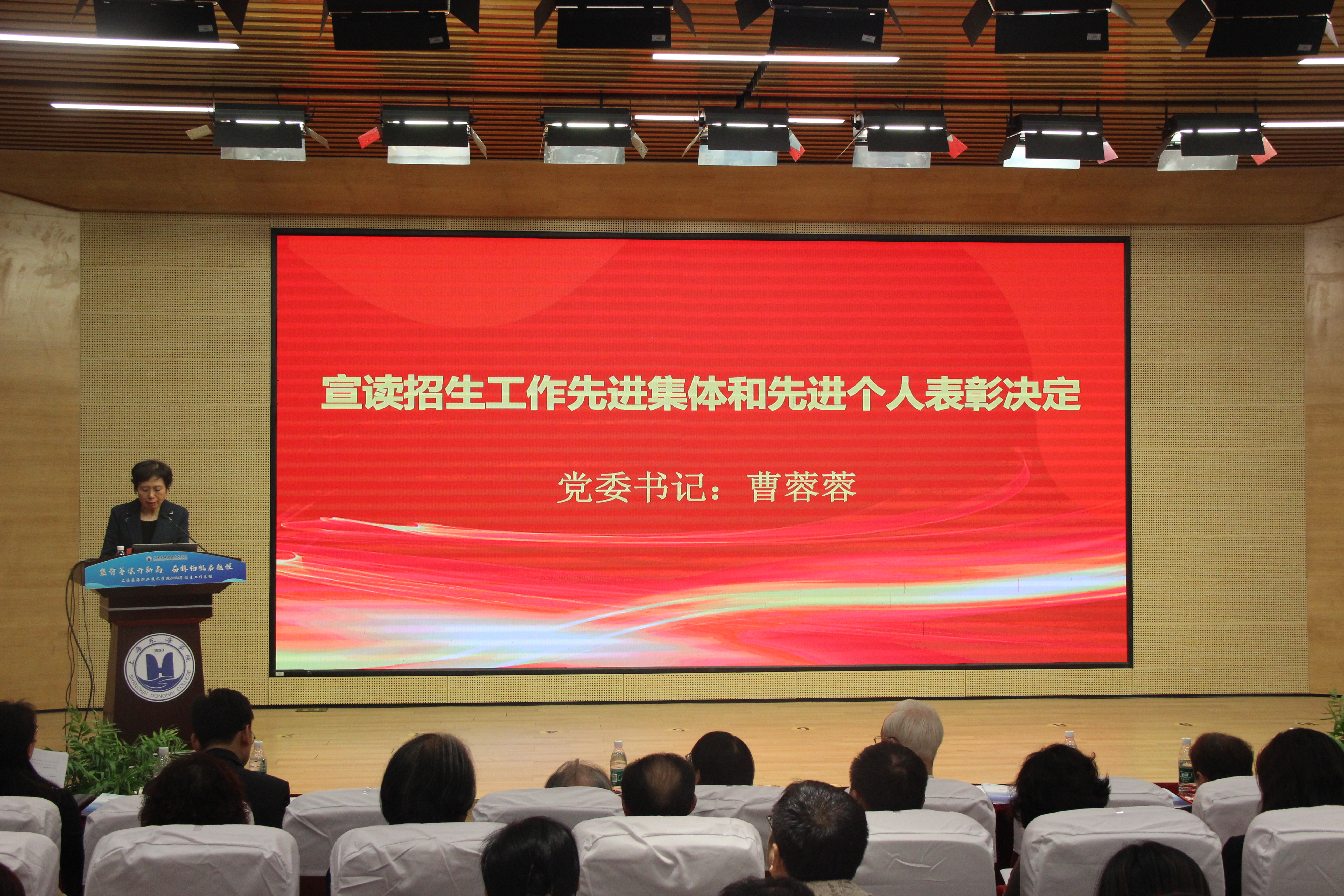 会议对在本年度招生工作中表现突出的先进集体和优秀个人进行表彰,党委书记曹蓉蓉宣读表彰决定。本年度共有5个二级学院获得“招生工作先进集体”荣誉称号,3个二级学院和3个职能部门获得“招生宣传工作先进集体”荣誉称号,共有10名师生获得招生工作“先进个人”或“优秀志愿者”荣誉称号。董事会和校领导为获奖单位及个人颁奖。