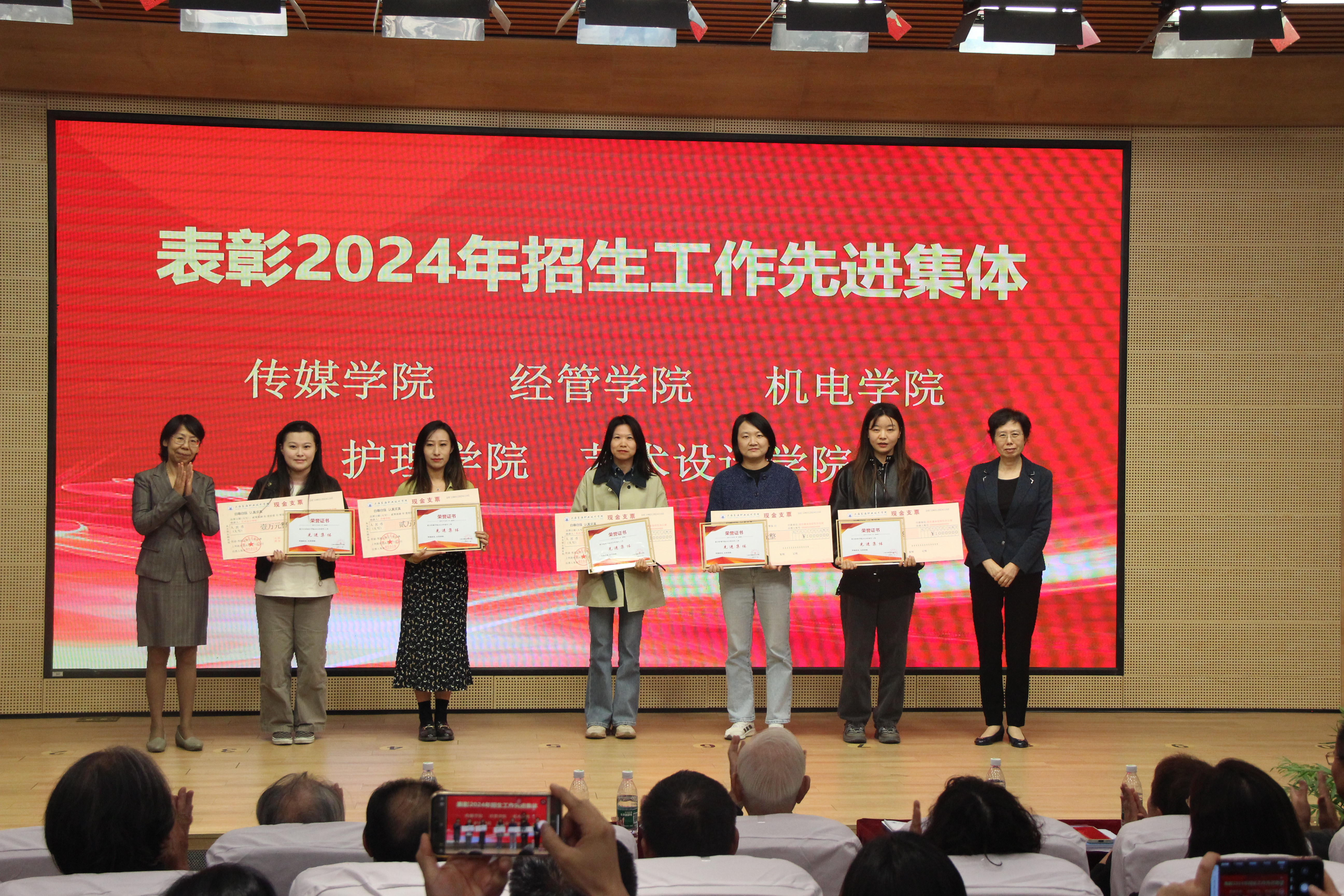 11月7日,学校2024年招生工作总结表彰大会顺利召开。本次会议对2024年招生工作进行全面总结与分析,并对工作中涌现出的先进集体和优秀个人进行表彰。董事会、校党政领导、各职能部门主要负责人,各二级学院院长、直属支部书记,行政办主任,参加年度招生宣传工作相关人员及招生就业处全体出席。会议由副校长郁萍主持。