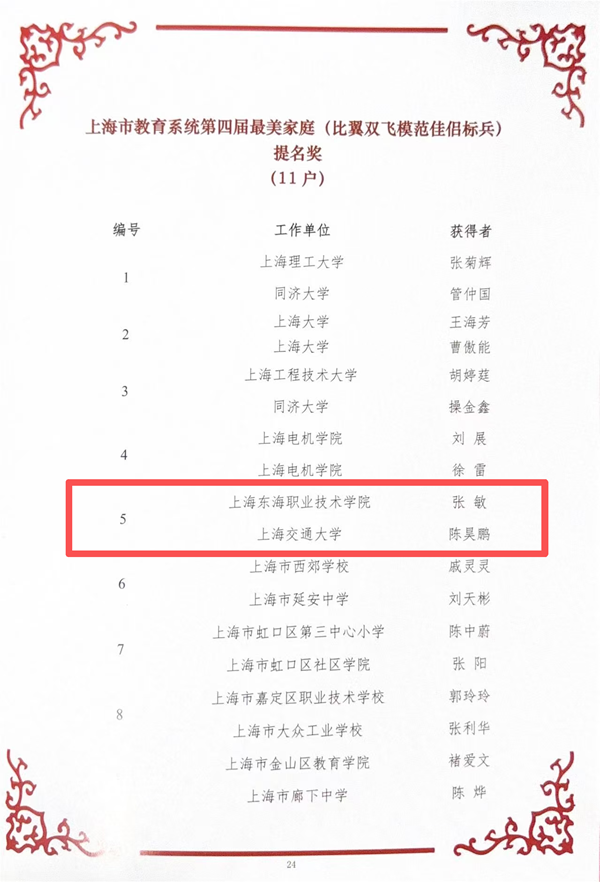 为深入贯彻习近平总书记关于注重家庭家教家风建设的重要论述,全面贯彻落实党的二十大和二十届历次全会关于传承弘扬中华民族家庭美德的精神,响应中国妇女十三大号召,进一步推动家庭文明新风尚建设,上海市教育工会、市教育系统妇工委组织开展了上海市教育系统第十五届比翼双飞模范佳侣、第四届最美家庭评选活动,经评审公示后于“三八”国际妇女节大会中予以表彰。